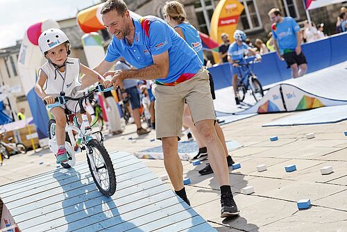 In St. Wendel haben alle Kids von 13.00 bis 18.00 Uhr die Möglichkeit, in einer großen Fahrrad-Erlebniswelt mit unterschiedlichen Modulen ihre Fähigkeiten im Radfahren auszutesten und unter professioneller Anleitung zu verbessern. kinder Joy of Moving-Botschafter und Rad-Legende Jens Voigt wird als Experte in der Fahrrad-Erlebniswelt den Kids unter anderem wichtige Hilfestellung für den sicheren Umgang mit dem Fahrrad geben.