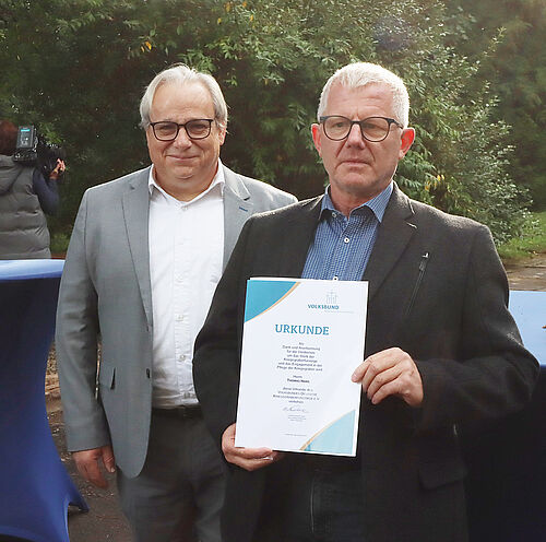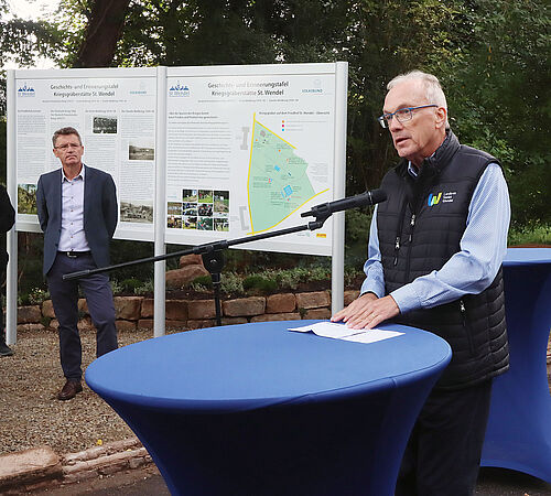 „Es sind die schmerzvollen Gewalterfahrungen und Schicksale, die uns Menschen gleichermaßen treffen - überall, grenzüberschreitend und international“, sagte St. Wendels Bürgermeister Peter Klär während der Einweihung der Gedenktafeln. „Kriegsgräber als Lernorte tragen zu Lernen aus der Vergangenheit und Lernen für die Zukunft bei. Wir als Kreisstadt unterstützen dieses Projekt der Erinnerungskultur sehr gerne und zwar durch aktives Mittun. Im Rahmen eines Ausbildungsprojektes haben wir mit unseren Auszubildenden dazu beigetragen, diesen Lernort zu gestalten. Das Ergebnis ist Friedensarbeit, die mit eigenen Händen greifbar und sichtbar ist.“