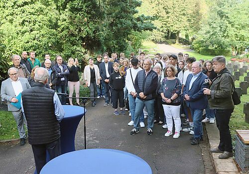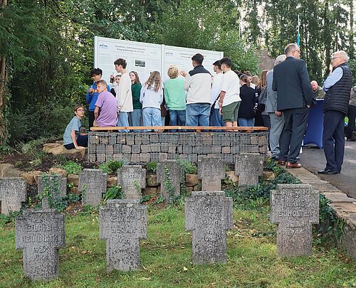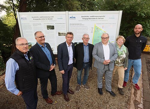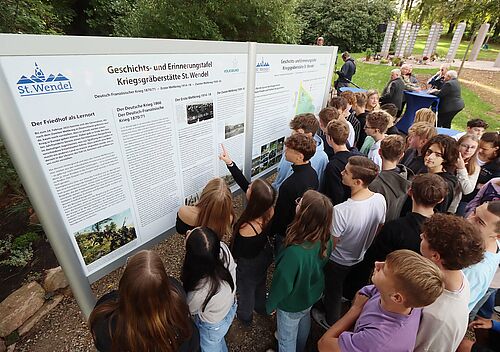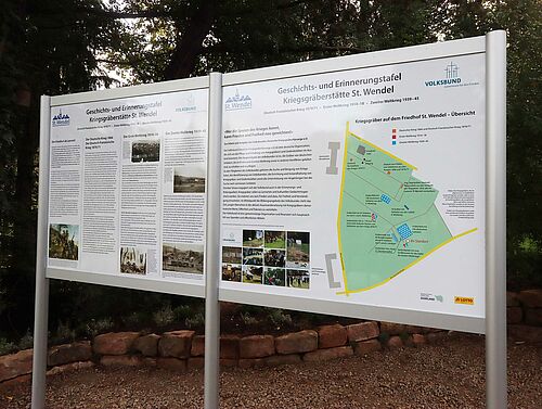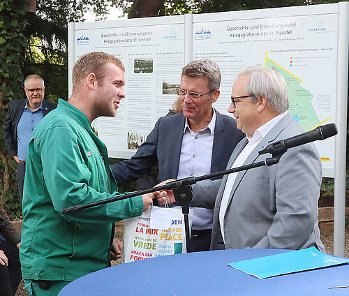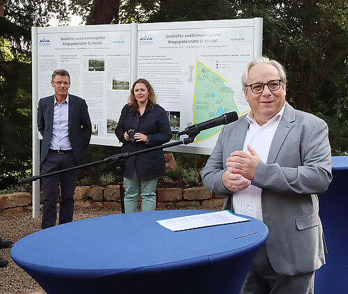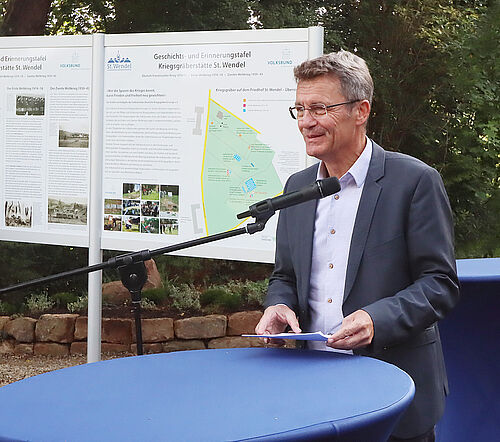 „Es sind die schmerzvollen Gewalterfahrungen und Schicksale, die uns Menschen gleichermaßen treffen - überall, grenzüberschreitend und international“, sagte St.  Wendels Bürgermeister Peter Klär während der Einweihung der Gedenktafeln.  „Kriegsgräber als Lernorte tragen zu Lernen aus der Vergangenheit und Lernen für die Zukunft bei. Wir als Kreisstadt unterstützen dieses Projekt der Erinnerungskultur sehr gerne und zwar durch aktives Mittun. Im Rahmen eines Ausbildungsprojektes haben wir mit unseren Auszubildenden dazu beigetragen, diesen Lernort zu gestalten. Das Ergebnis ist Friedensarbeit, die mit eigenen Händen greifbar und sichtbar ist.“