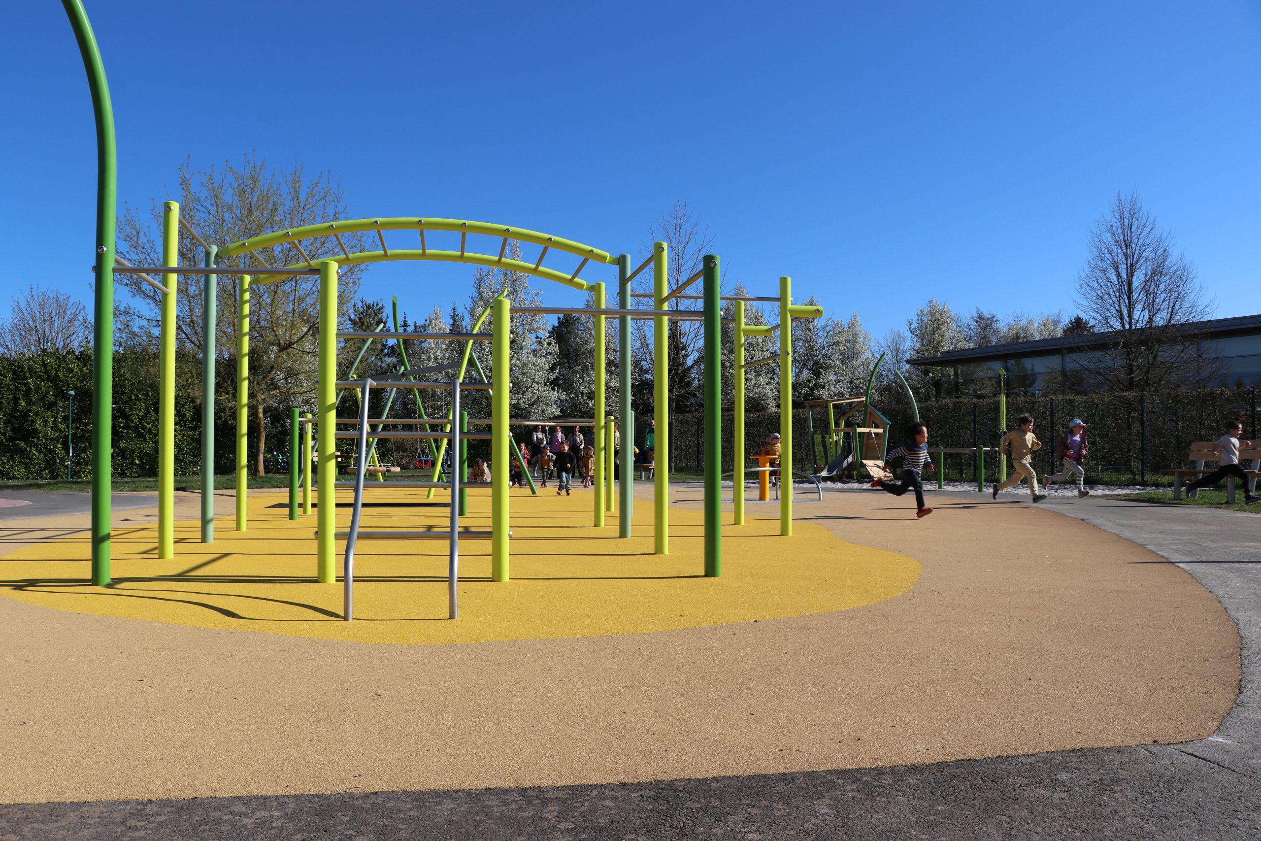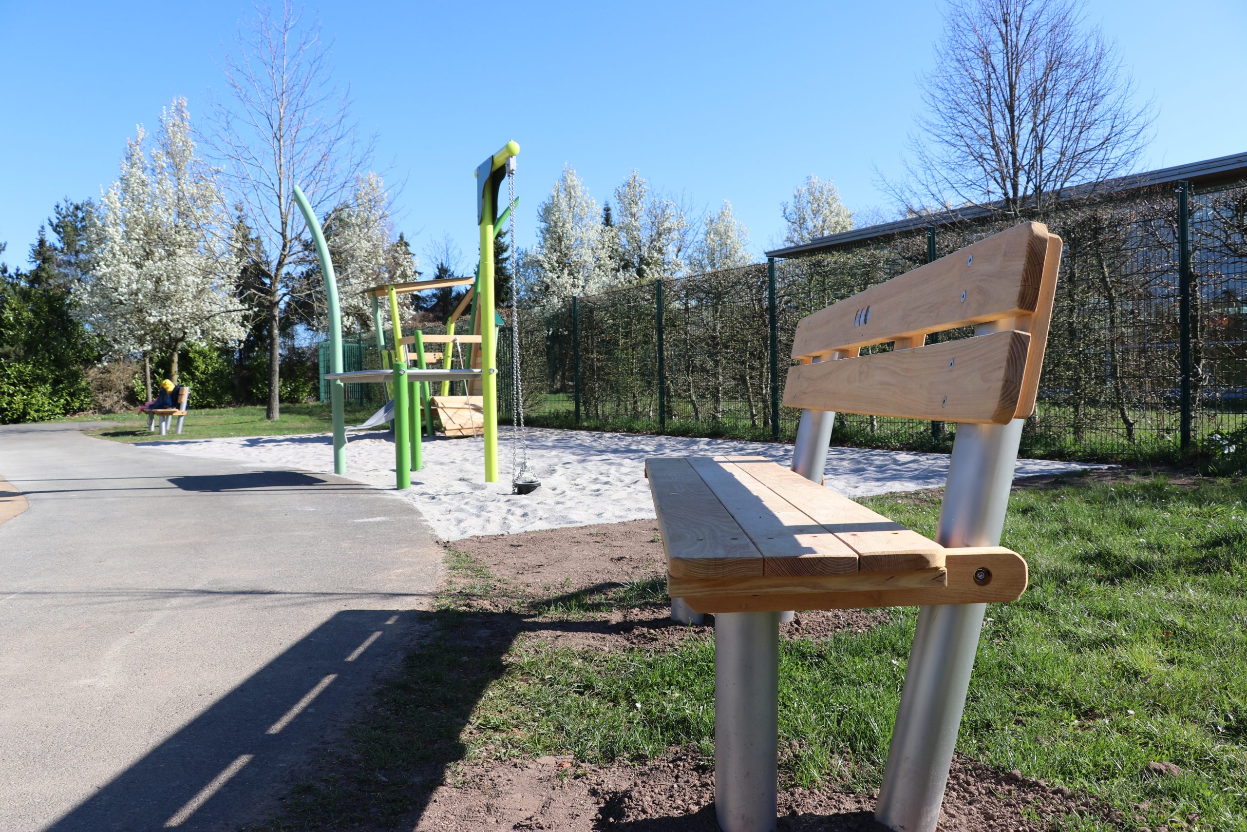 Die Ausstattung des neuen Platzes umfasst unter anderem ein Rollstuhlfahrer-Trampolin, ein Kleinkinderspielhaus mit unterfahrbarem Siebtisch, ein Inklusionskarussell sowie eine Nest-Doppelschaukel mit Kleinkindersitz – allesamt gezielt als Inklusionsspielgeräte konzipiert. Ergänzt wird das Angebot durch ein großes Spielkombi-Gerät, eine moderne Calisthenicsanlage mit Kombibarren, Seniorenbänke sowie eine gemütliche Sitzgruppe. Frisch gepflanzte Bäume ergänzen den einladenden Aufenthaltsraum im Freien, farbliche Akzente an den Geräten verleihen der Anlage ihr modernes Aussehen und ein neu gestalteter Fallschutzbelag sorgt für die nötige Sicherheit.